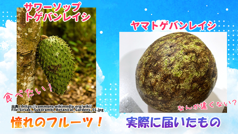 いや~、説明すると長くなるんですけど、サワーソップって書かれた商品を沖縄のお店で買ったらヤマトゲバンレイシが届いたんですよ。何が起きたのかを画像で説明するとこんな感じ。