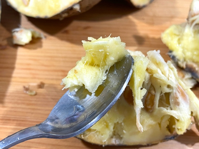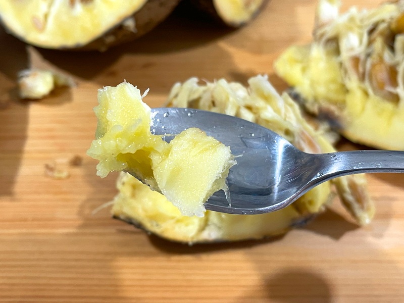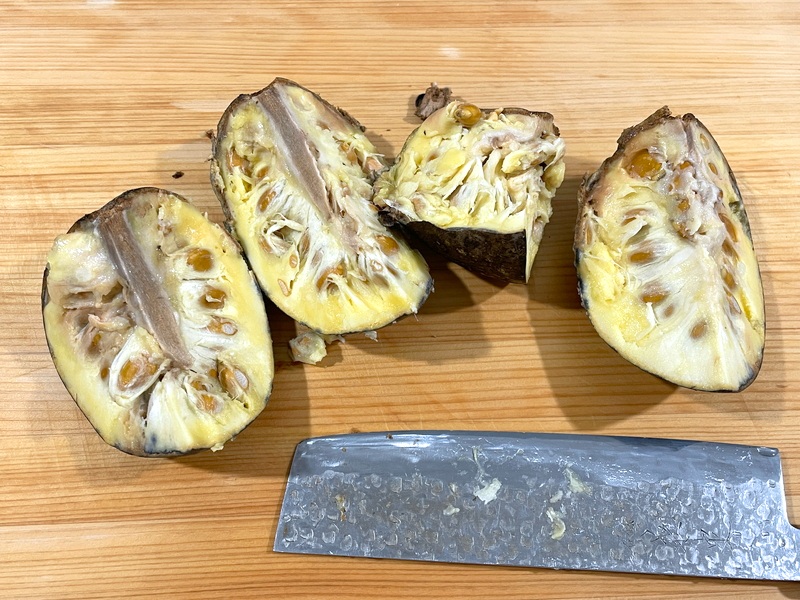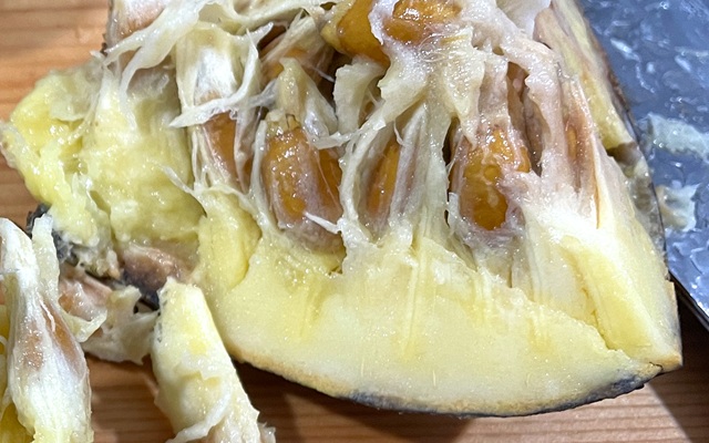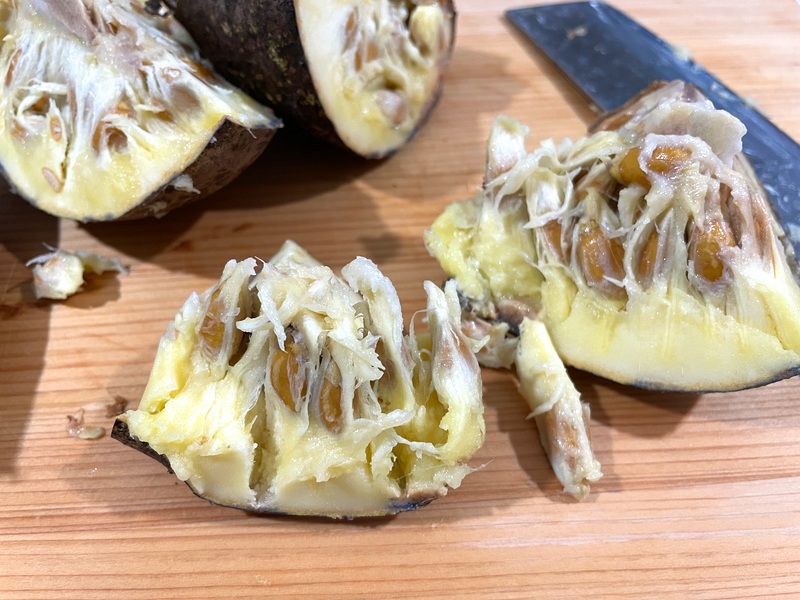 果肉はバナナやアボカドみたいにねっとり、もっちりしていて、それがパイナップルより丈夫な繊維質にくっついてる感じ。歯応えだけなら割とおいしい部類だけど、これだけ熟してるのに一切の甘味がないからおいしくありません。