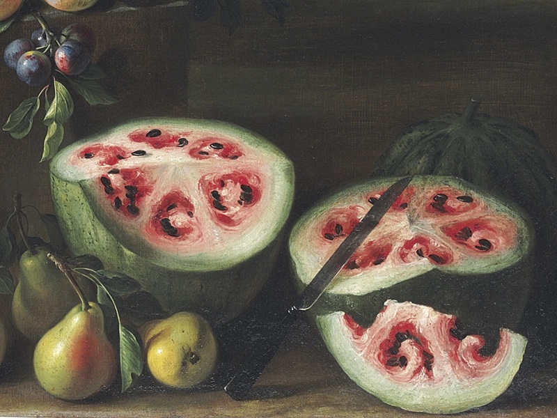 17世紀のスイカ(引用:https://commons.wikimedia.org/wiki/File:Giovanni_Stanchi,_Watermelons,_Peaches,_Pears,_and_Other_Fruit_in_a_Landscape.jpg)