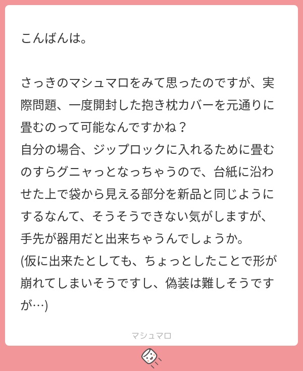 そんなマロを返していると別の方から「未開封品みたいに畳んで戻すって難しくないですか?」なんてマロも届きました。