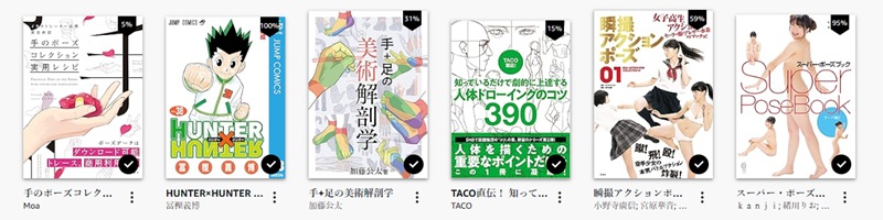 3日前に買った一番左の書籍は色分けしてあって見やすいけど、Webで無料公開している部分が多いのと男性の手でクセもあるからおすすめはしないかな。(一つのポーズを複数の角度で見られるのは良い)