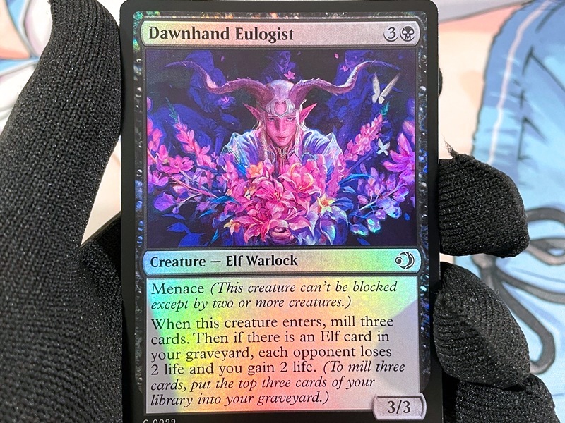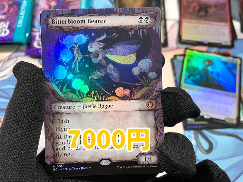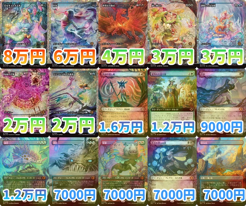 1月25日現在、最低80万円くらい。全ての言語のパックから排出される可能性があって、英語版のみで存在して世界に500枚の大当たりです。なぜこんなに高いのかと言うと、MTGでも指折りの人気があるイラストレーターさんなんですよね。なので、コレクター需要が一回り二回り高くて、なんでもない番号が既に100万円で取り引きされています。イラストがこれ限定だから「イラストがいいな~」と思ったら、この500枚を手に入れるしかないんですよね。