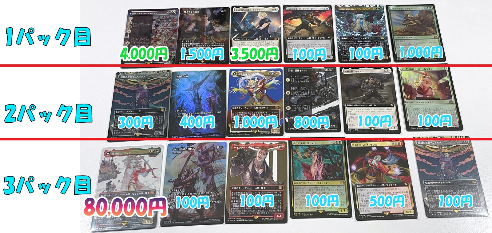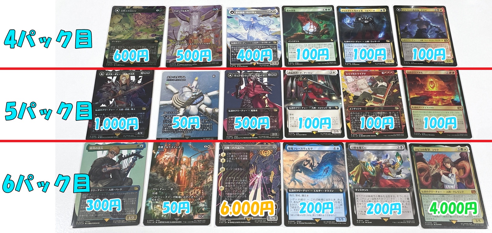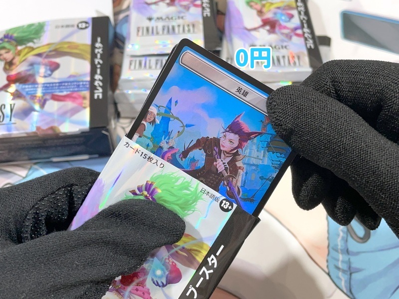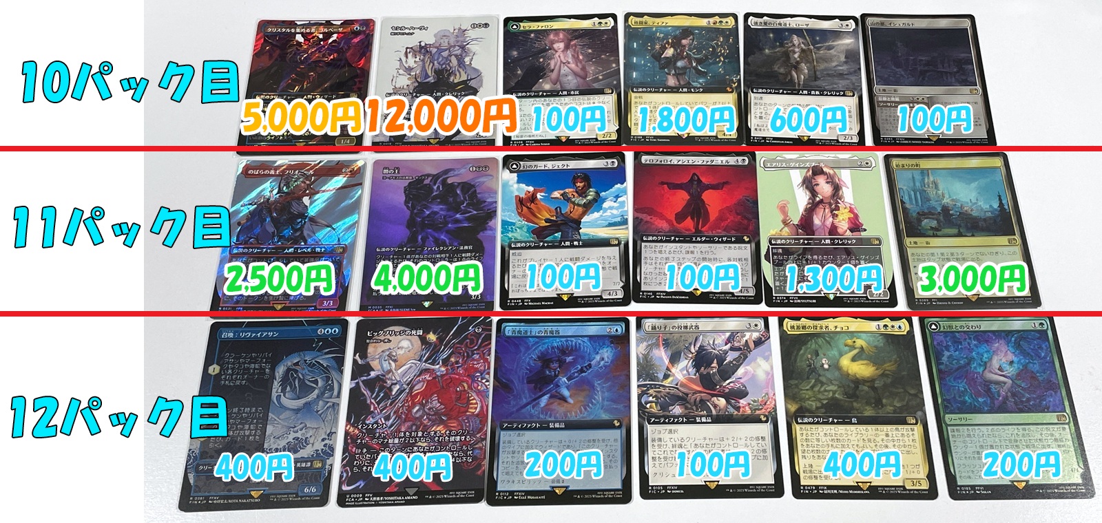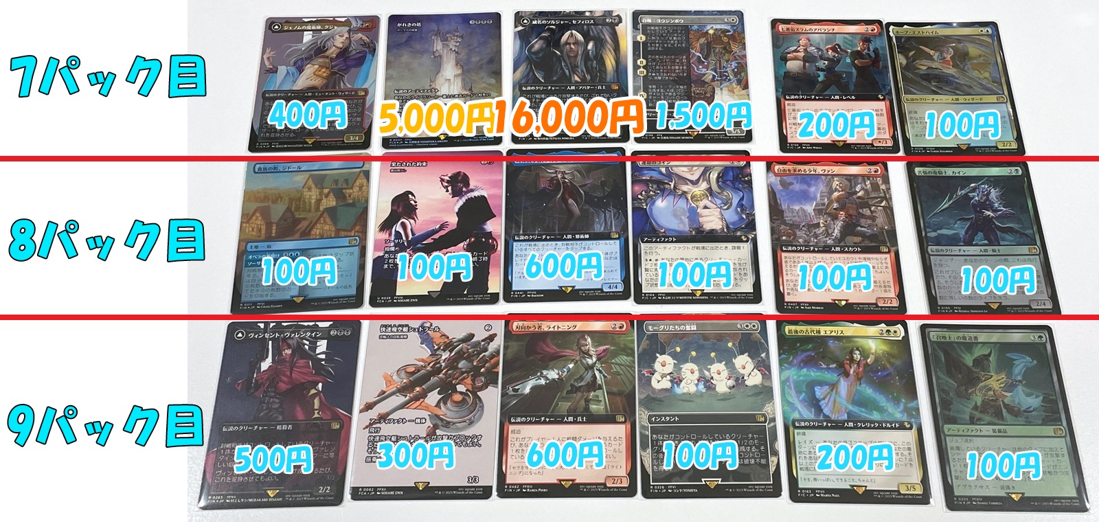 パックもおさらい。1枚目はゲーム進行に使うトークンカードで0円、2枚目が一番高い排出枠でチョコボが出ます。3枚目もそこそこ高い枠。4~7枚目が1万円以上のカードが出るレア枠。残りは安価なコモンって構成です。