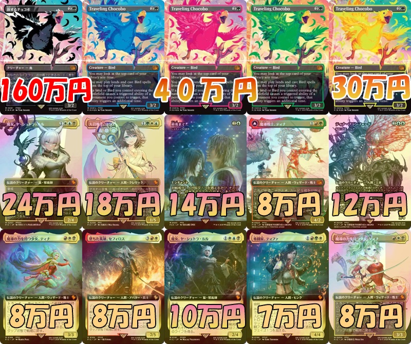 いつもなら需要が落ち着いて値段が下がるのですが、FFが人気すぎるせいか上がり気味なんですよね。中でもチョコボは恩恵を受けていて黒が80万円→150万円、色チョコボが16~30万円→30~40万円になりました。あと英語版ボックスのみから出てくる金のチョコボは今1,000万円になってたりするんですよ。
