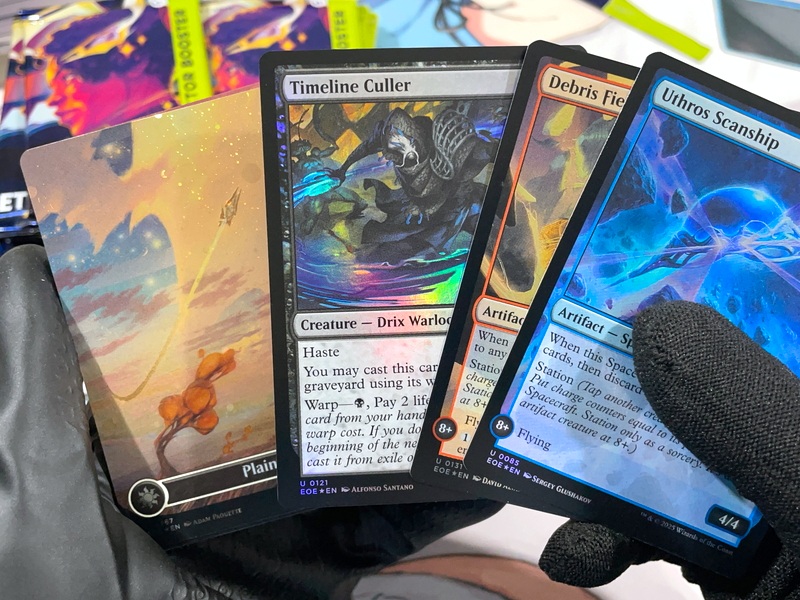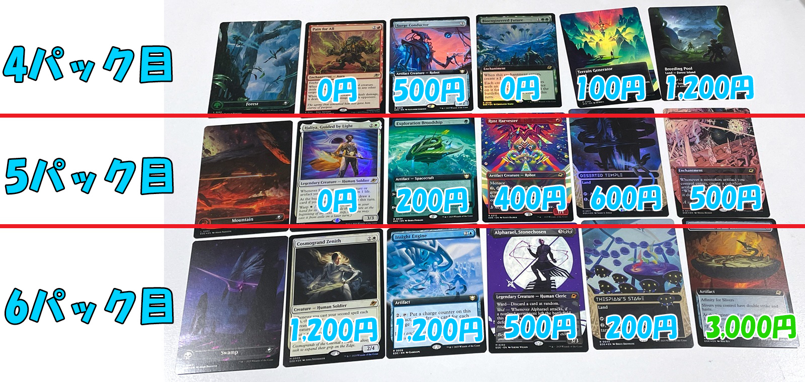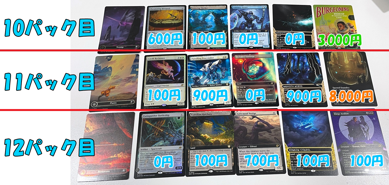 最初はコモンゾーン。それからアンコモンと続いて基本土地を挟んでレアって構成です。便宜上、値段は付けてないけどアンコモン枠で300円くらいのTimeline Culler引いててちょっと嬉しい。