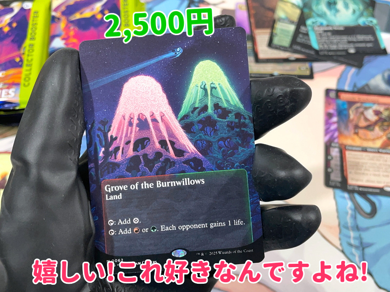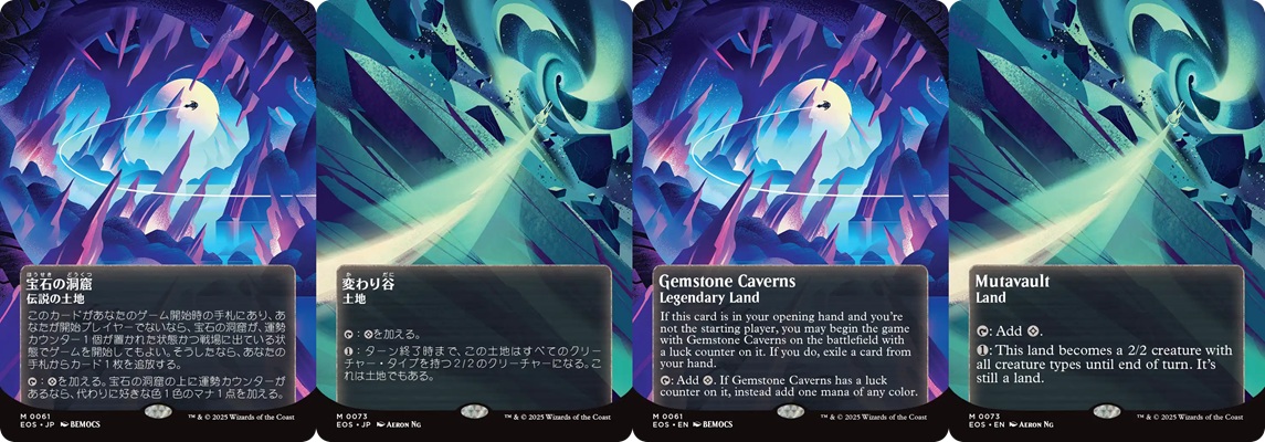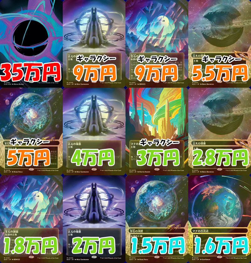 私が欲しいのは宝石の洞窟変わり谷のギャラクシーFoil2枚。それぞれ7万円と1万円。洞窟が高すぎて開けるか~となったわけですよ。あと、このイラストだと「日本語より英語のほうが見栄えが良いかな~っ」て今回は英語版を選びました。そう感じる人が多いのか、英語版はしばらくして売り切れorプレミア価格で滑り込みで定価予約できたんですよ。